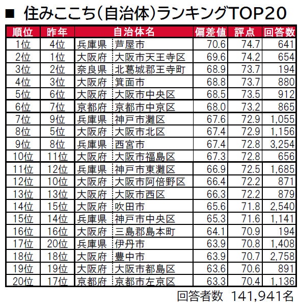 兵庫県芦屋市が、昨年4位から順位を上げて1位です。2位は昨年1位の大阪府大阪市天王寺区、3位は、昨年は2位の奈良県北葛城郡王寺町です。トップ10内では、10位に大阪府大阪市福島区が昨年11位から順位を一つ上げてトップ10入りしていますが、それ以外の自治体は順位の変動はあるものの、顔ぶれは同じという結果になっています。