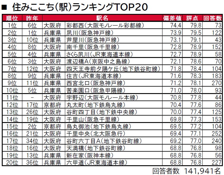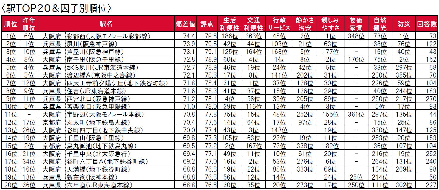 1位は、昨年6位の彩都西(大阪モノレール彩都線)です。2位は、昨年1位の夙川(阪急神戸線)、3位は、昨年10位の芦屋川(阪急神戸線)です。トップ10内では、7位に四天王寺前夕陽ケ丘(地下鉄谷町線)(昨年12位)、9位に西宮北口(阪急神戸線)(昨年11位)が順位を上げてトップ10入りしています。