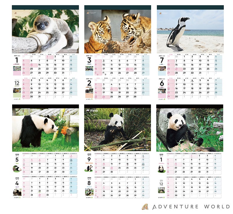 アドベンチャーワールド(和歌山県白浜町)は、2024年11月26日(火)より、2025年版のオリジナルカレンダー(A2サイズのオールキャスト・パンダファミリーの2種類、卓上カレンダー1種類 合計3種類)を販売いたします。パンダファミリーをはじめ、各月のメインにはパークで暮らす動物たちの生き生きとした姿を捉えた最新の写真を採用しています。