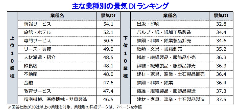 「中小企業」(42.5)…同0.1ポイント減。3カ月連続で悪化。『サービス』は、旅行控えなどもあり「旅館・ホテル」が3カ月連続、「飲食店」が2カ月連続で大きく落ち込んだ。食品価格の値上げで包装資材の需要が低迷した「出版・印刷」も悪化した。