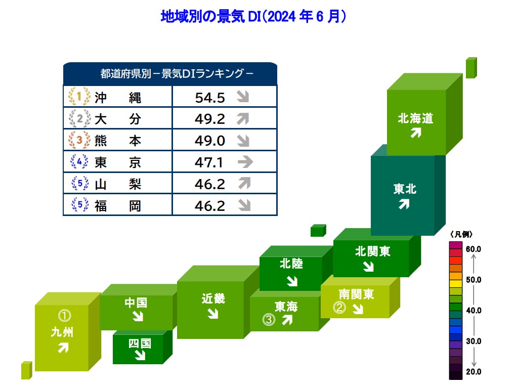 『北陸』(40.7)… 同1.6ポイント減。2カ月連続で悪化。域内4県が2年5カ月ぶりにすべて悪化した。能登半島地震からの復旧・復興に遅れがみられ、『建設』は再び悪化に転じた。国内旅行が伸び悩む一方で、インバウンド消費は好調だった。