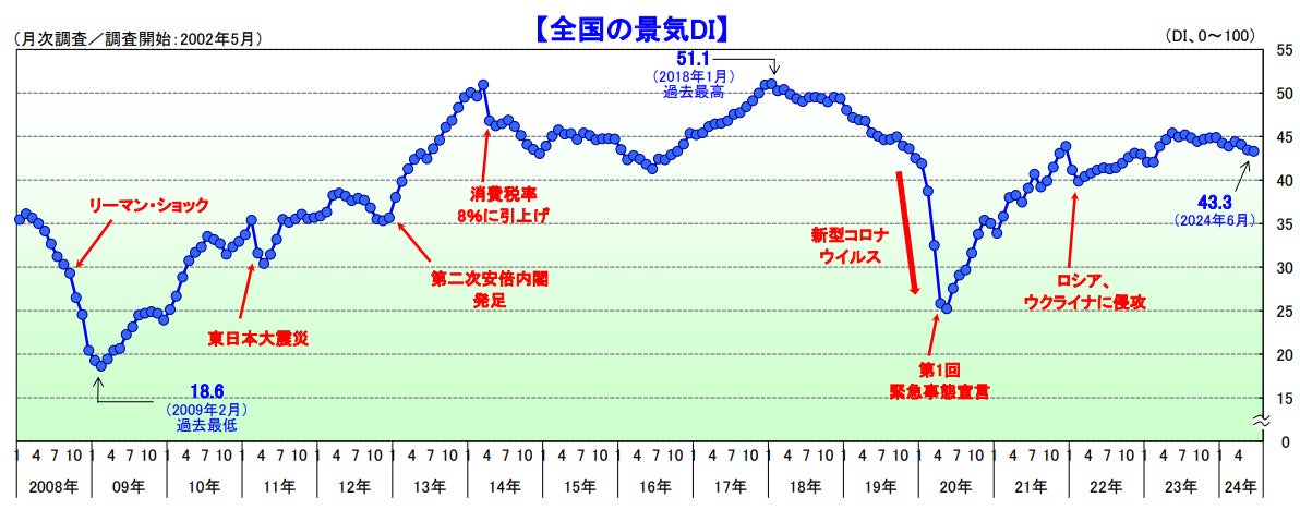 2024年6月の景気DIは前月比0.2ポイント減の43.3となり、3カ月連続で悪化した。国内景気は、円安にともなうコスト負担の高まりや個人消費の落ち込みにより改善が進まなかった。3カ月連続の悪化は2020年5月以来4年1カ月ぶり。