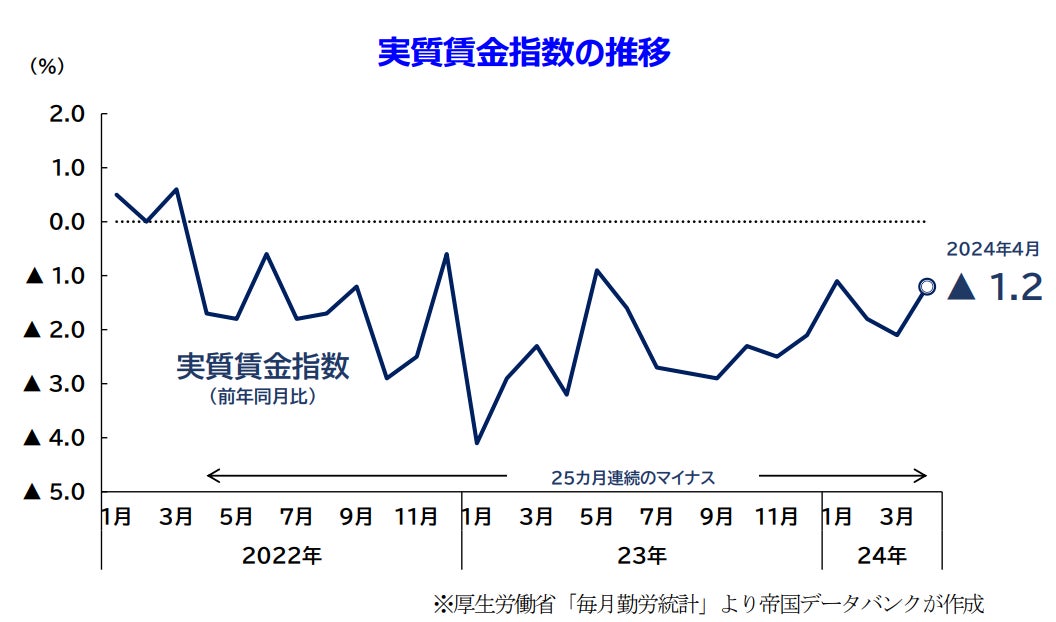 実質賃金は、25カ月連続(2022年4月~2024年4月)でマイナスとなっている