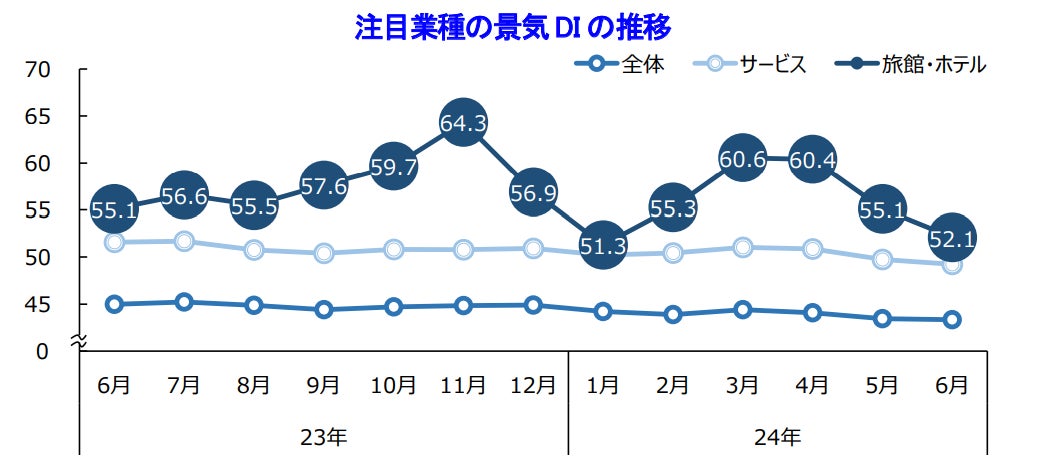 6月は、宿泊業や娯楽サービス業など個人向けサービスを中心に個人消費DIが大きく落ち込んだ。円安による原材料価格の高止まりなどコスト負担の増加が景況感を下押しする要因となった。