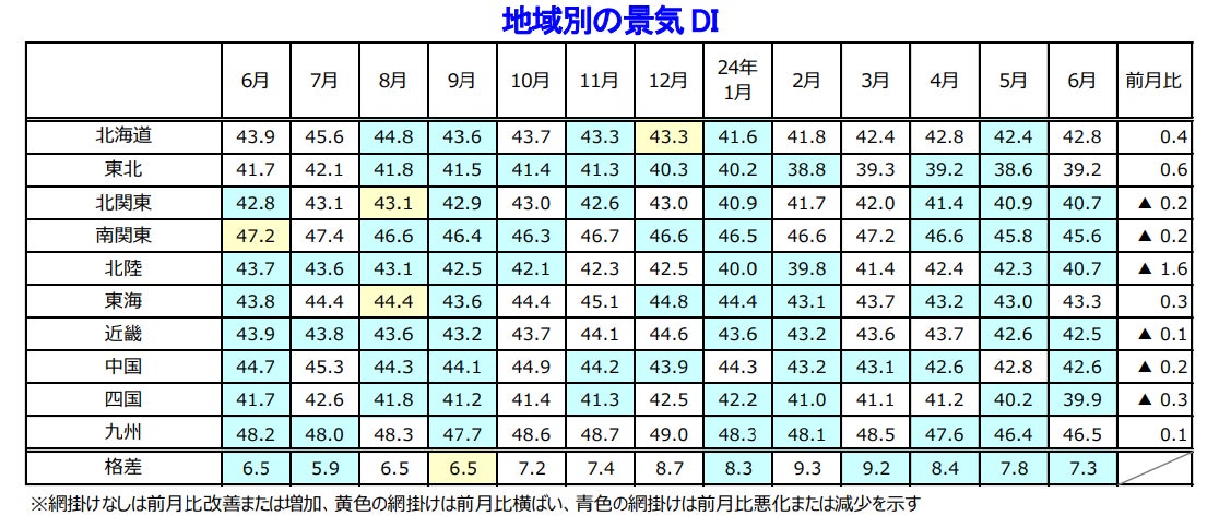 『東北』(39.2) … 同0.6ポイント増。3カ月ぶりに改善。域内6県中4県が改善し、「福島」と「宮城」は3カ月ぶりに上向きへと転じた。設備稼働率が改善し工事の発注も増え始めたほか、近県からの旅行増などもプラス材料となった。