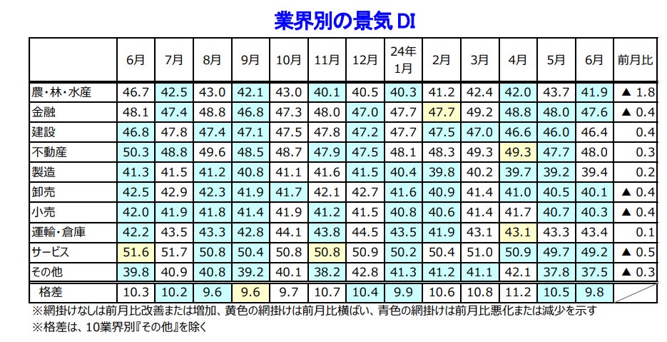 『サービス』や『小売』など10業界中6業界で悪化した。個人消費の停滞が続いたことに加え、円安による原材料価格の高止まりや人件費の増加などが重荷となった。他方、インバウンド需要や半導体、ホテル関連の設備投資などはプラス材料だった。