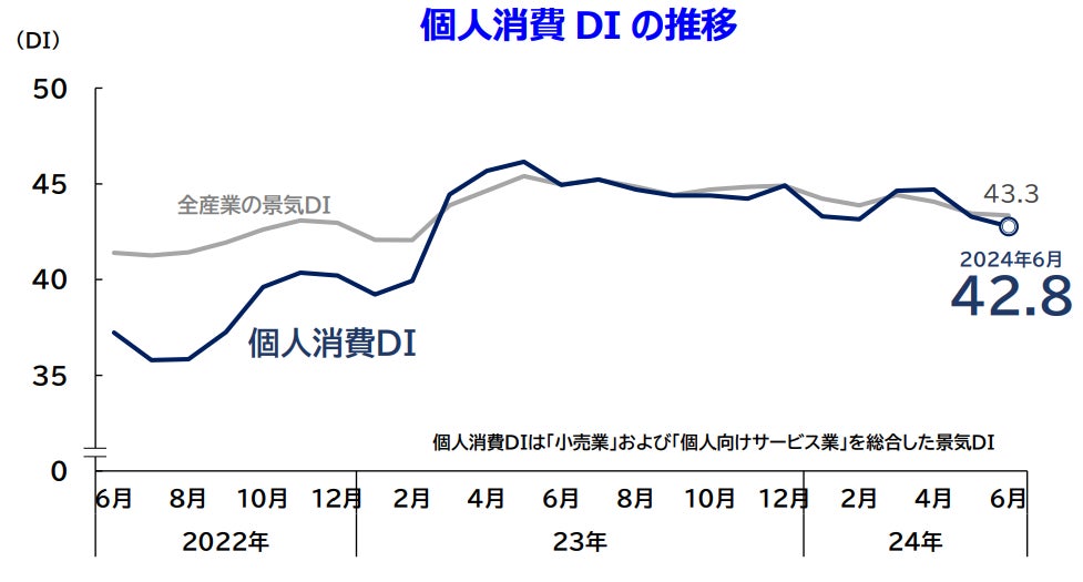 個人消費DIは、42.8(前月比0.5ポイント減)と2カ月連続で落ち込んだ。企業からは消費者の節約志向を懸念する声が多数寄せられた