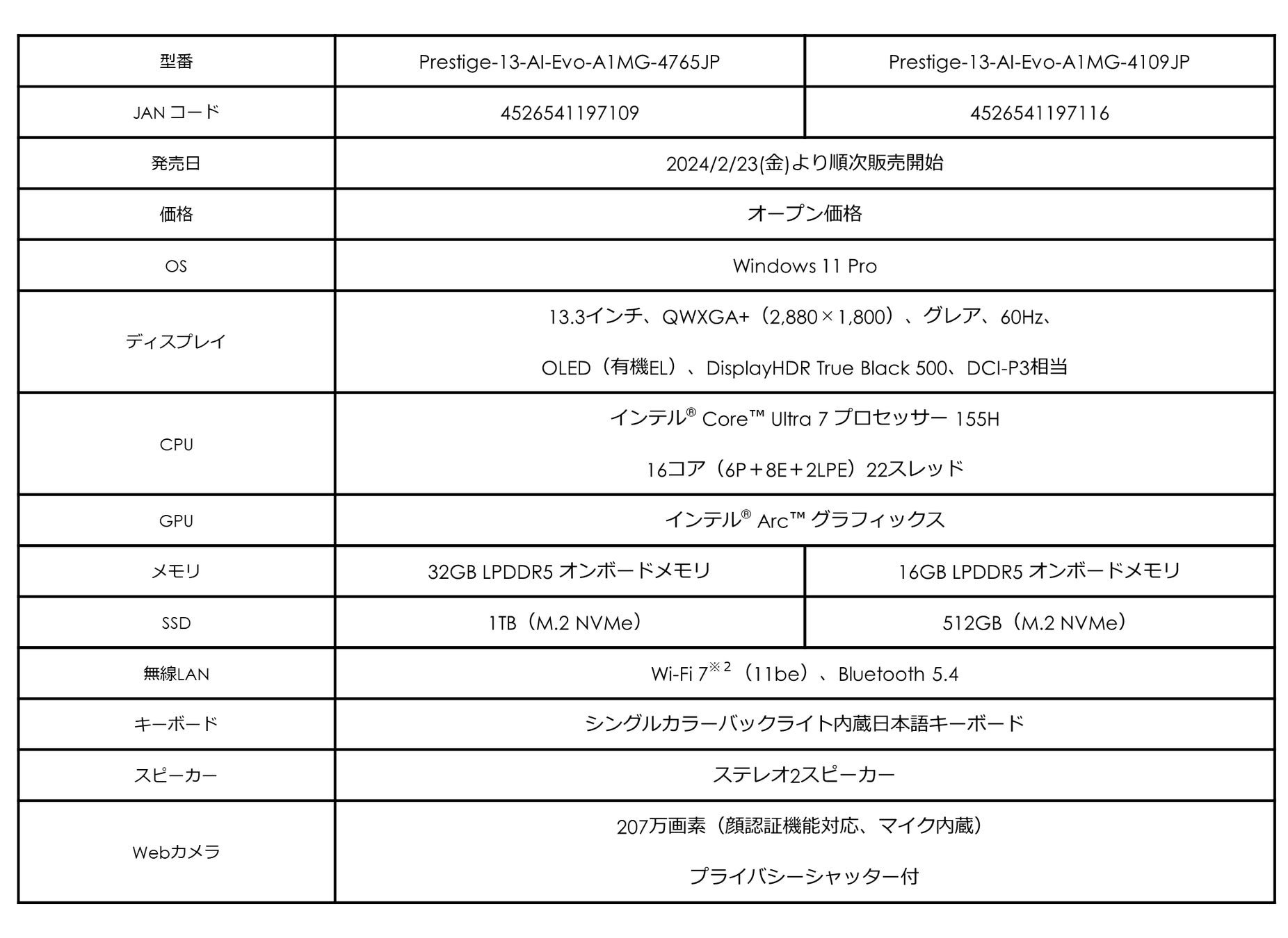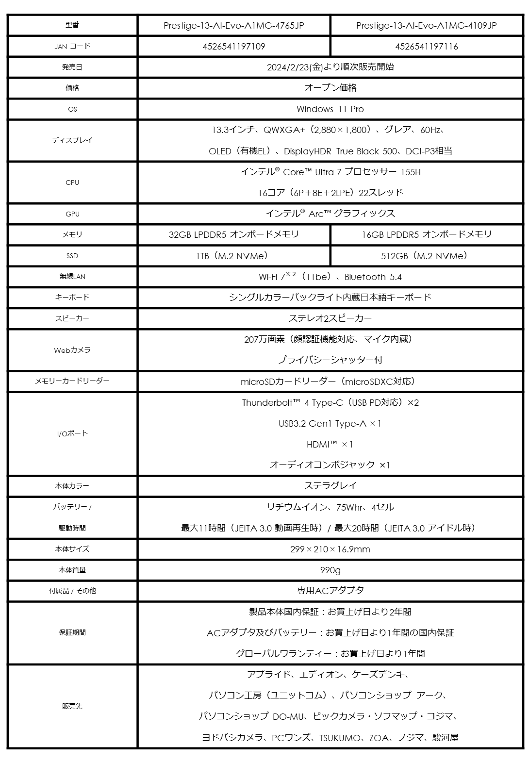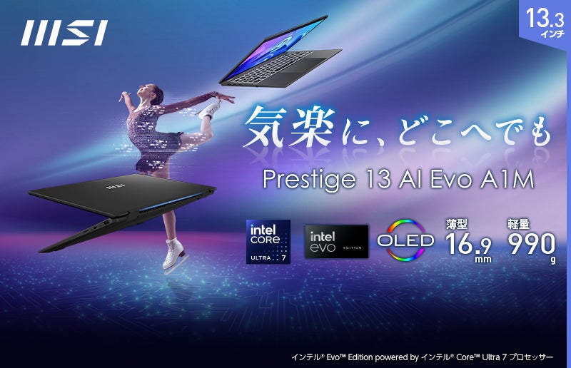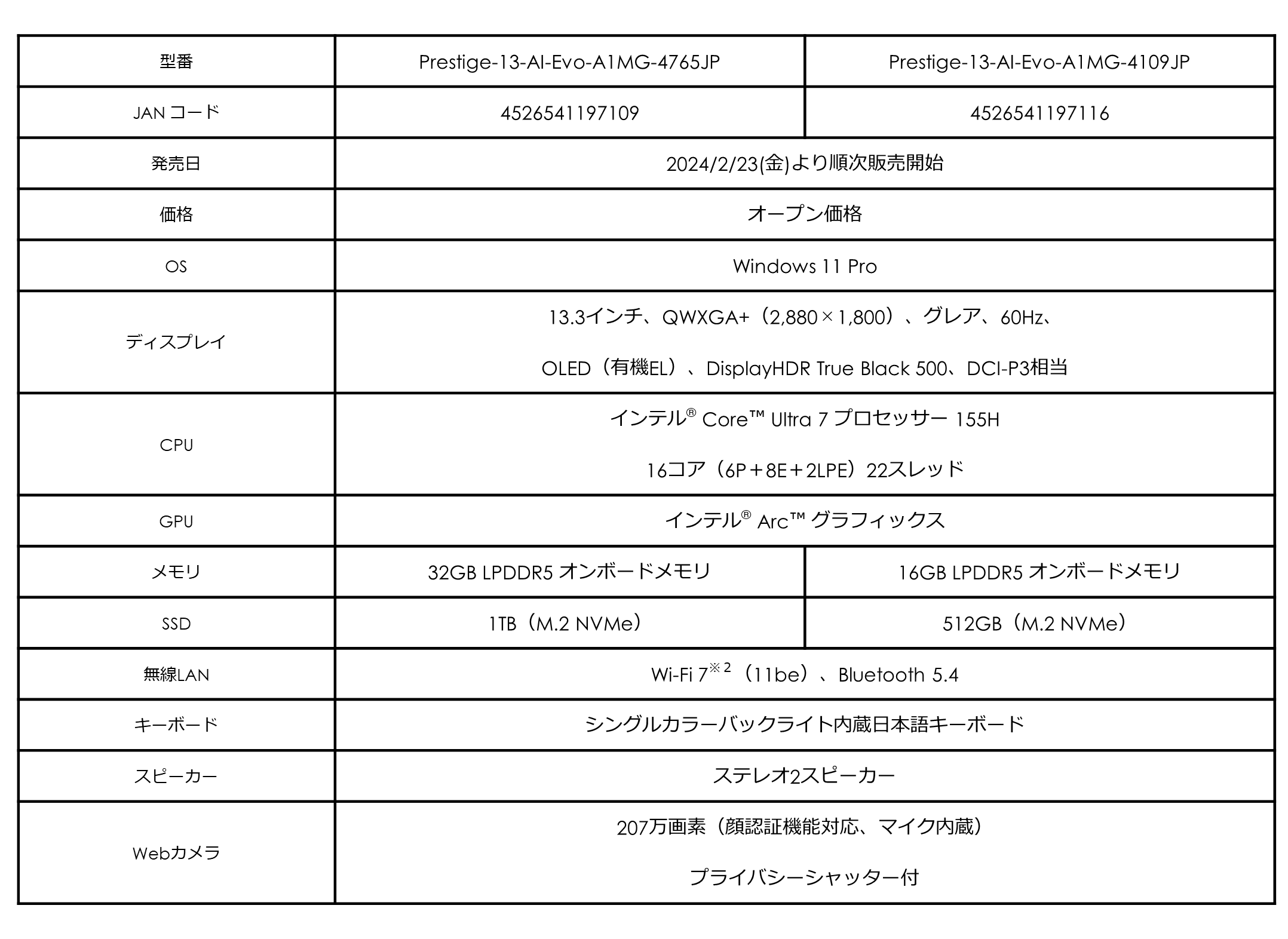 「Core™ Ultra プロセッサー」を採用し、AI機能と省電力機能を強化 高解像度・広色域OLED(有機EL)ディスプレイ搭載 高性能ノートPC「Prestige 13 AI Evo A1M」発売
