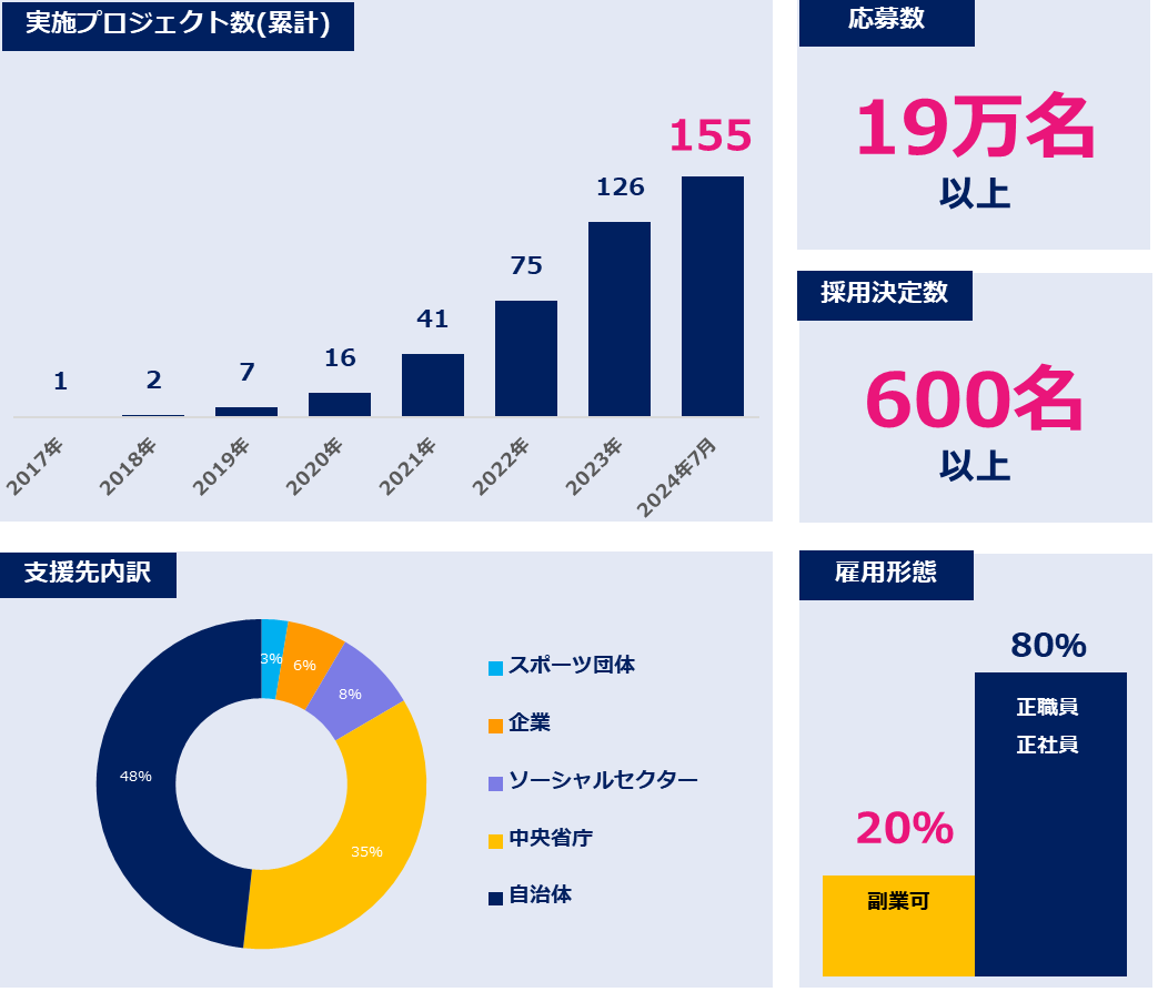 「ソーシャルインパクト採用プロジェクト」は2017年の開始以来、150以上の組織・団体の皆さまをご支援してまいりました。すでに600名以上の方がプロジェクトを通じて新たなミッションに就き、活躍されています。