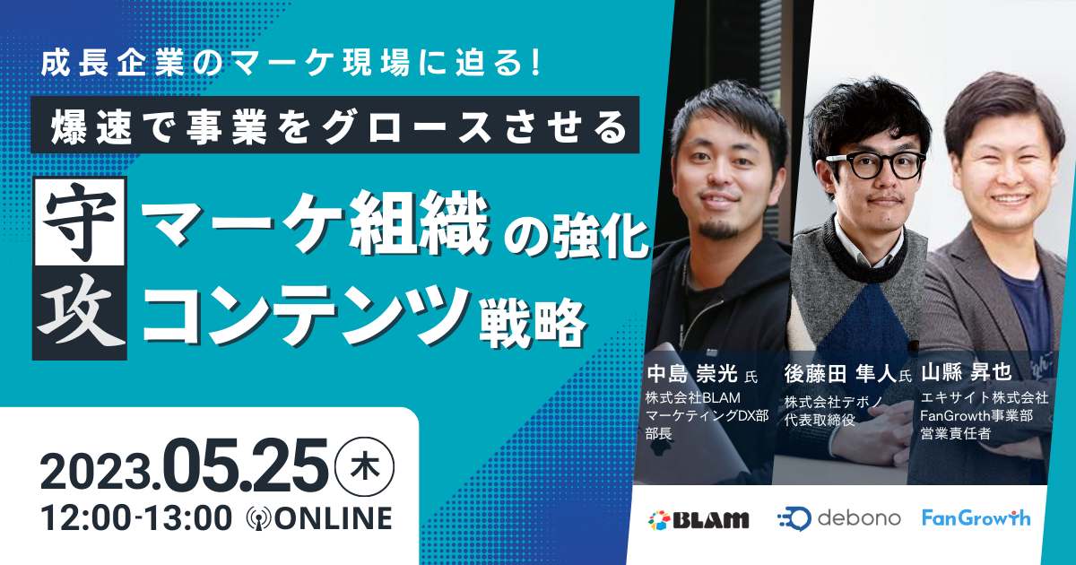 本ウェビナーではデジタルマーケティング・制作事業・複業支援を手掛ける株式会社BLAMの中島氏と、サブスクリプション型の資料作成サービスを提供する株式会社デボノの後藤田氏をお招きし、守りの施策であるマーケ組織の強化のお話しと、攻めの施策の中でも初動で取り組みやすいコンテンツマーケティングの戦略についてお話しいただきます。