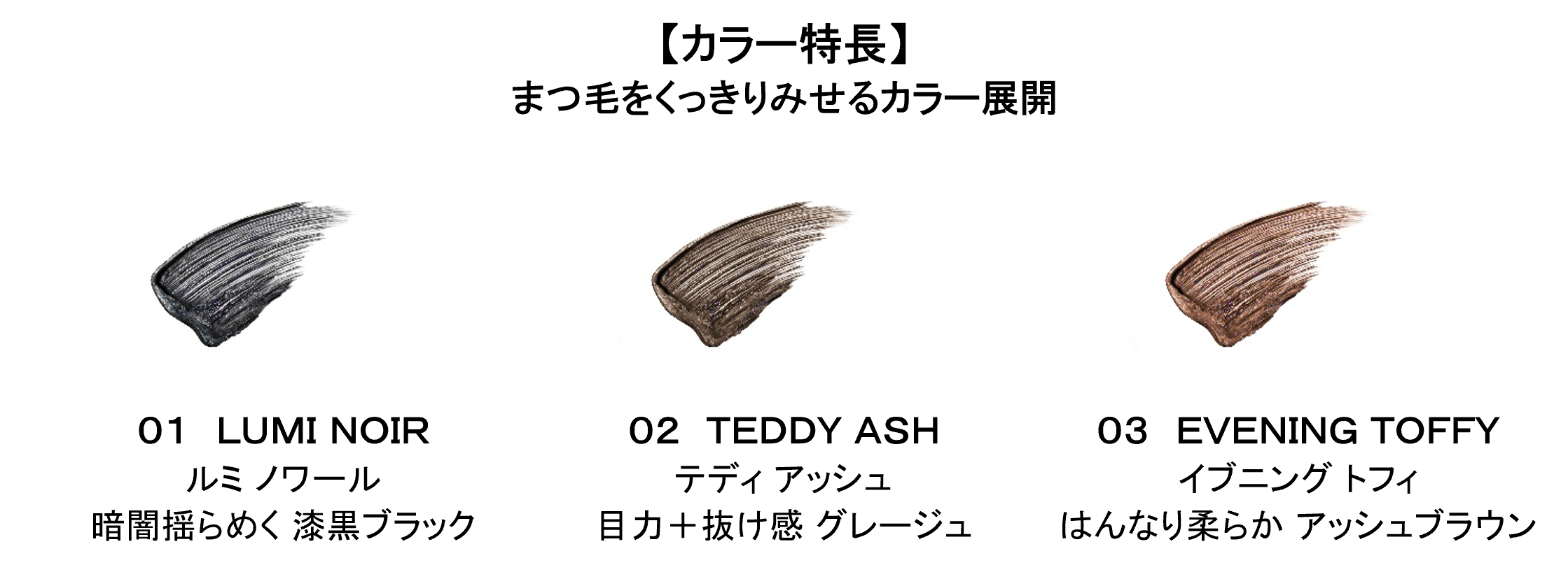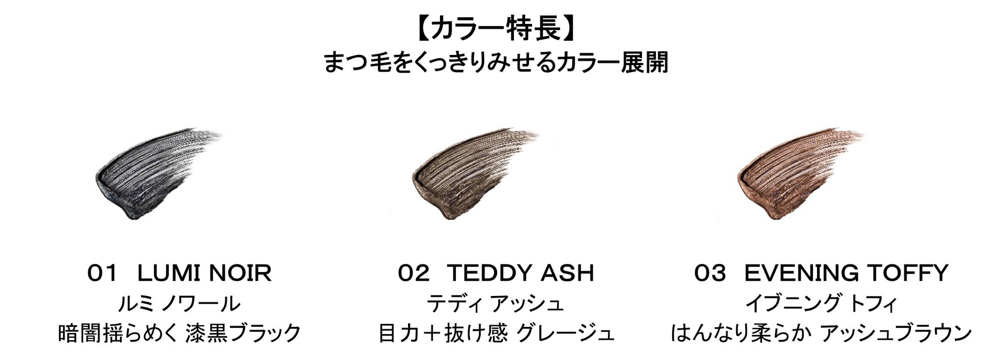 リニューアル前のカラーマスカラのラインナップから一変し、ベーシックカラーを揃えた白みのないくっきりとしたラインナップとなりました。