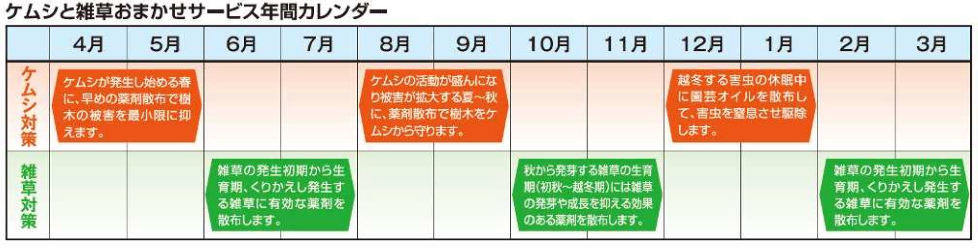 「ケムシ対策」3回、「雑草対策」3回と、病害⾍と雑草の⽣⻑に合わせてサービスを⾏う事で、年間をとおして安⼼してお過ごしいただけます。