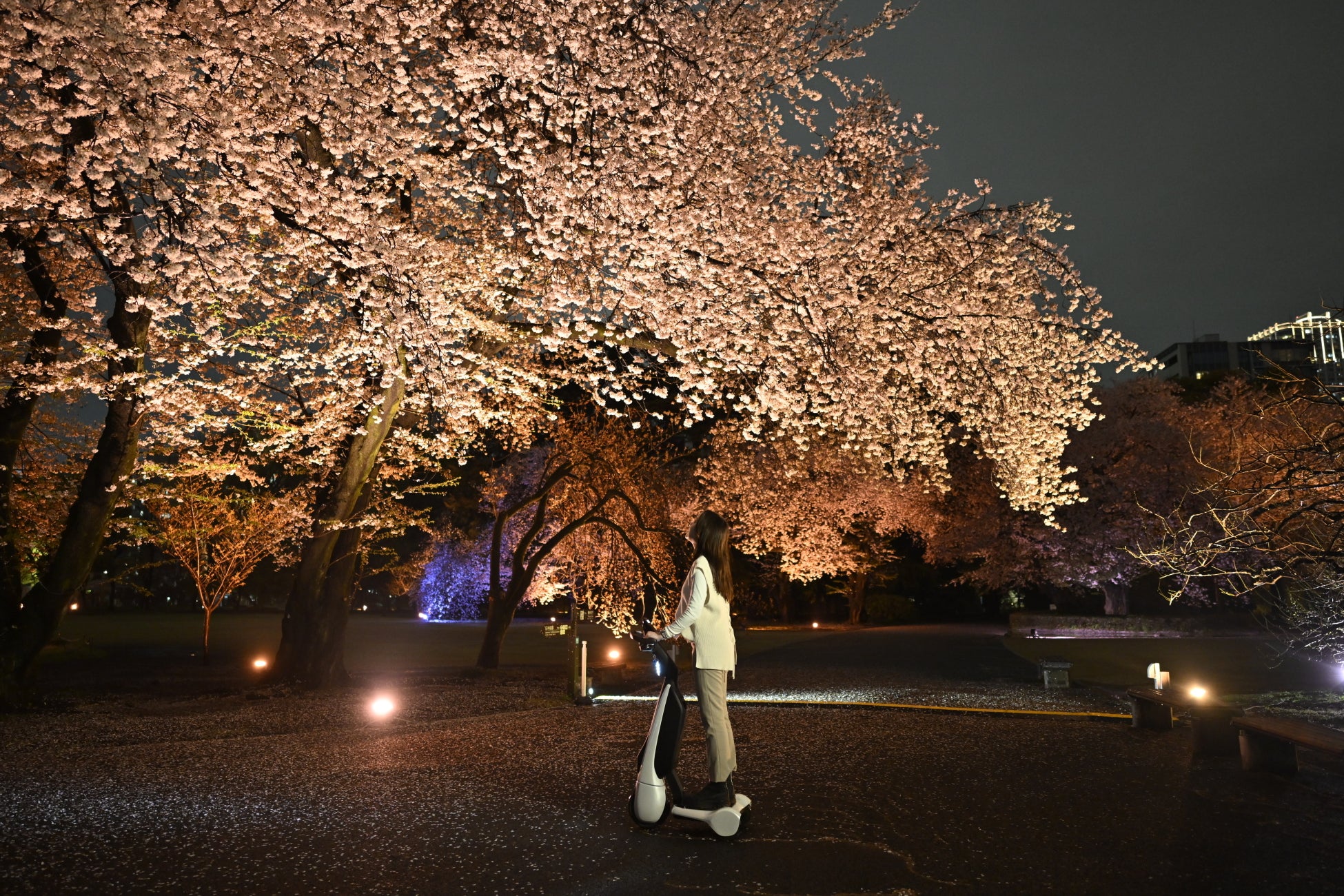 ソメイヨシノがライトアップされたウォークエリア。NAKEDディスタンス提灯®️を片手に、照明と音楽で演出された夜桜の世界へ。トヨタの小型モビリティ「C⁺walkシリーズ」に乗りながら光のアートを楽しめる『桜の通い路 collaboration with トヨタ C⁺walkシリーズ』の体験ゾーンも登場。「C⁺walkシリーズ」で通ると、動きに合わせて地面が桜色に変わり幻想的にライトアップ。桜の花びらが華やかに舞うなか、試乗体験をお楽しみいただけます。