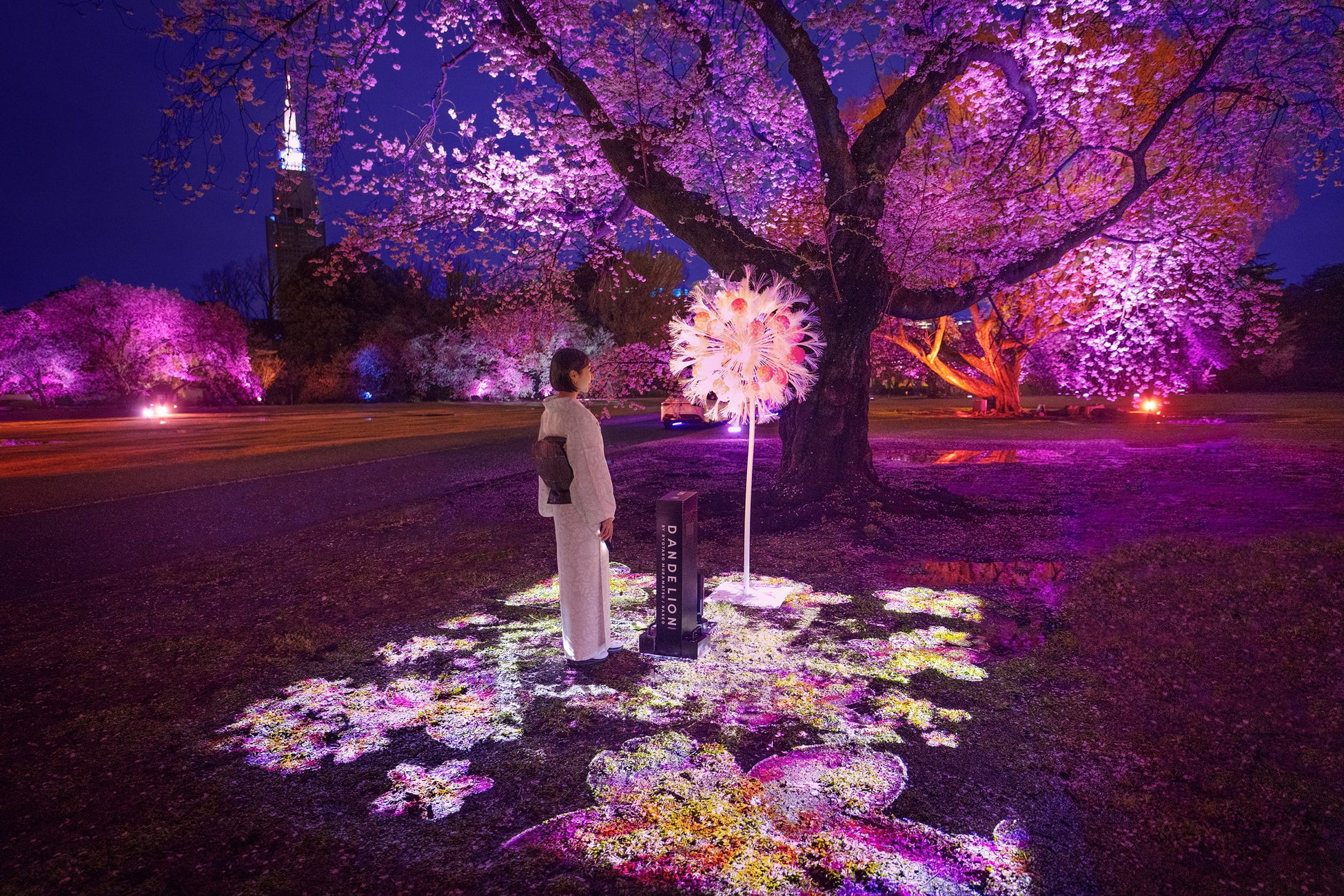 TREE by NAKEDのキッチンカーでのヴィーガンフード&ドリンクをお供にゆったり過ごせるアートお花見エリア。アーティスト 村松亮太郎の、平和の祈りで世界と繋がるアートプロジェクト『DANDELION PROJECT』が新宿御苑の桜とコラボレーションした新作『SAKURA DANDELION』が初登場。同時期に『DANDELION PROJECT』の参加箇所となっている京都・二条城と繋がり、お互いにネットワークを通じて、平和の花をプロジェクションマッピングで咲かせ合うことができます。また、約70種類の桜が咲く新宿御苑だからこそ、期間中、開花時期に合わせてプロジェクションマッピングされる桜が変わり、いつ来場されても、もっとも見頃の桜を楽しむことが出来ます。最後は桜の花びら柄が映し出された小径(こみち)で、幻想的な桜並木に包まれながら帰路へ。