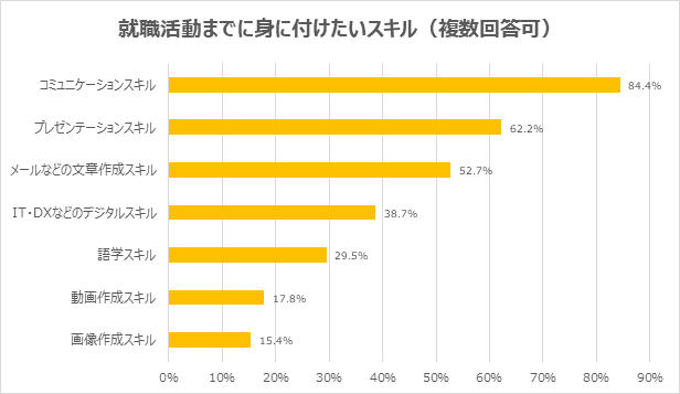 (2)就職活動までに身に付けたいスキルは「コミュニケーションスキル」が最多。