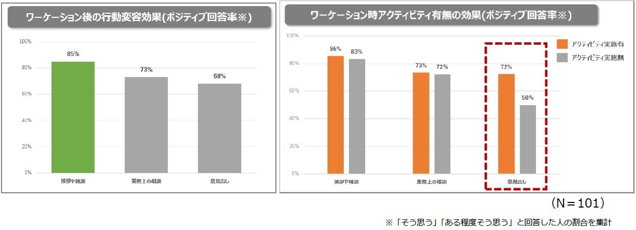 ●「ワーケーション実施以降、チーム内で『挨拶や雑談』『業務上の相談』『意見出し』がしやすくなったと思いますか?」という質問に対して、「挨拶や雑談がしやすくなった」と回答した割合は85%だった。また、ワーケーション中に相互理解を深めるアクティビティを実施したチームは、未実施のチームと比べて「意見出しがしやすくなった」と回答した割合が20%以上高かった。