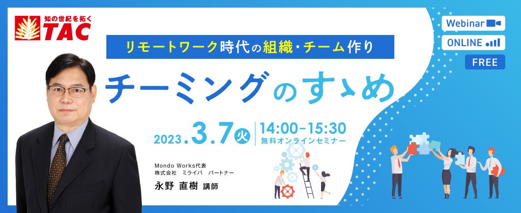 公認会計士や税理士など、多くの国家資格や検定試験の受験指導などの教育事業を展開しているTAC株式会社(東京都千代田区、代表取締役:多田敏男)は、法人向け人材教育部門から、リモートワーク下でのチームのコミュニケーション不全を解決する「リモートワーク時代の組織・チーム作り ~チーミングのすゝめ~ セミナー」を2023年3月7日(火)に実施します。