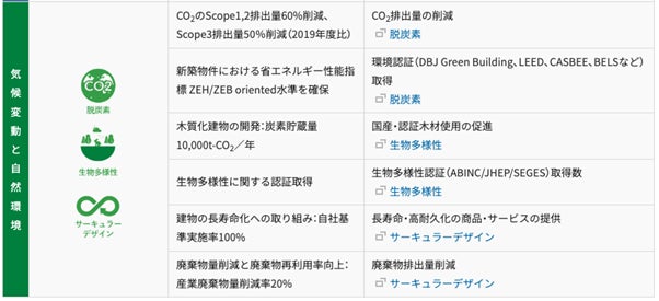 重点課題のひとつである「脱炭素」において、計測指標(KPI)として「CO2 のScope1,2 排出量60%削減、Scope3 排出量50%削減(2019 年度比)」や「新築物件における省エネルギー性能指標 ZEH/ZEB oriented 水準を確保」を掲げています。