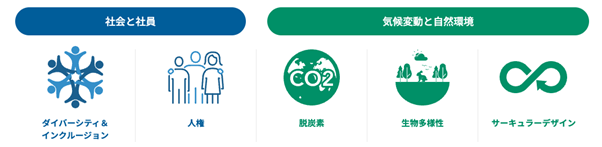 2050 年のありたい姿を実現するため、2030 年までに優先して取り組むべき課題として、「ダイバーシティ&インクルージョン」「人権」「脱炭素」「生物多様性」「サーキュラーデザイン」の5 つの重点課題を特定しています。