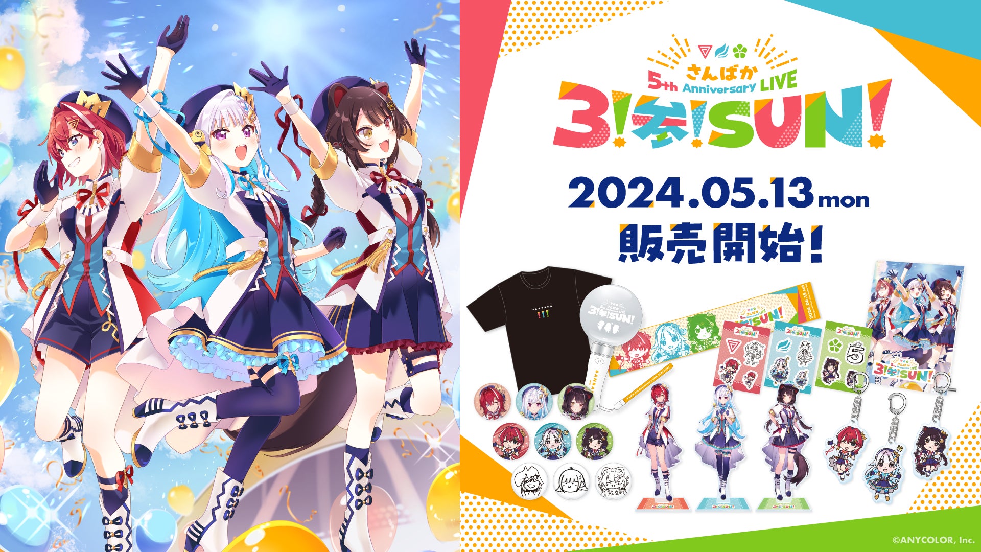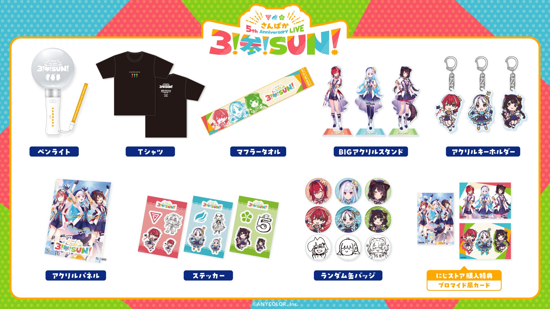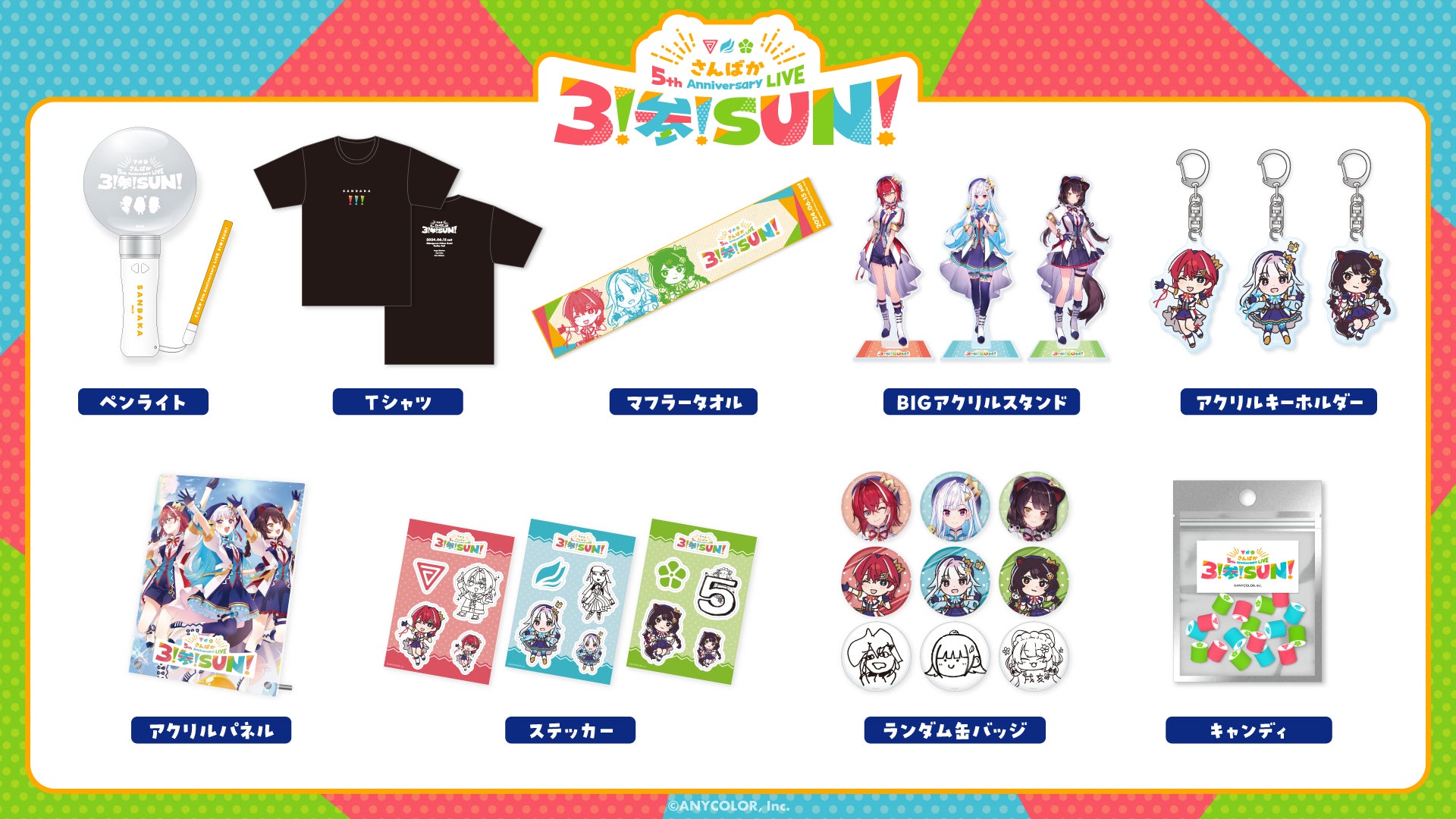 2024年6月15日(土)に品川プリンスホテル ステラボールにて開催される「さんばか 5th Anniversary LIVE 〜3!参!SUN!〜」(https://www.nijisanji.jp/events/sanbakalive_5thanniversary/)のライブグッズが登場!