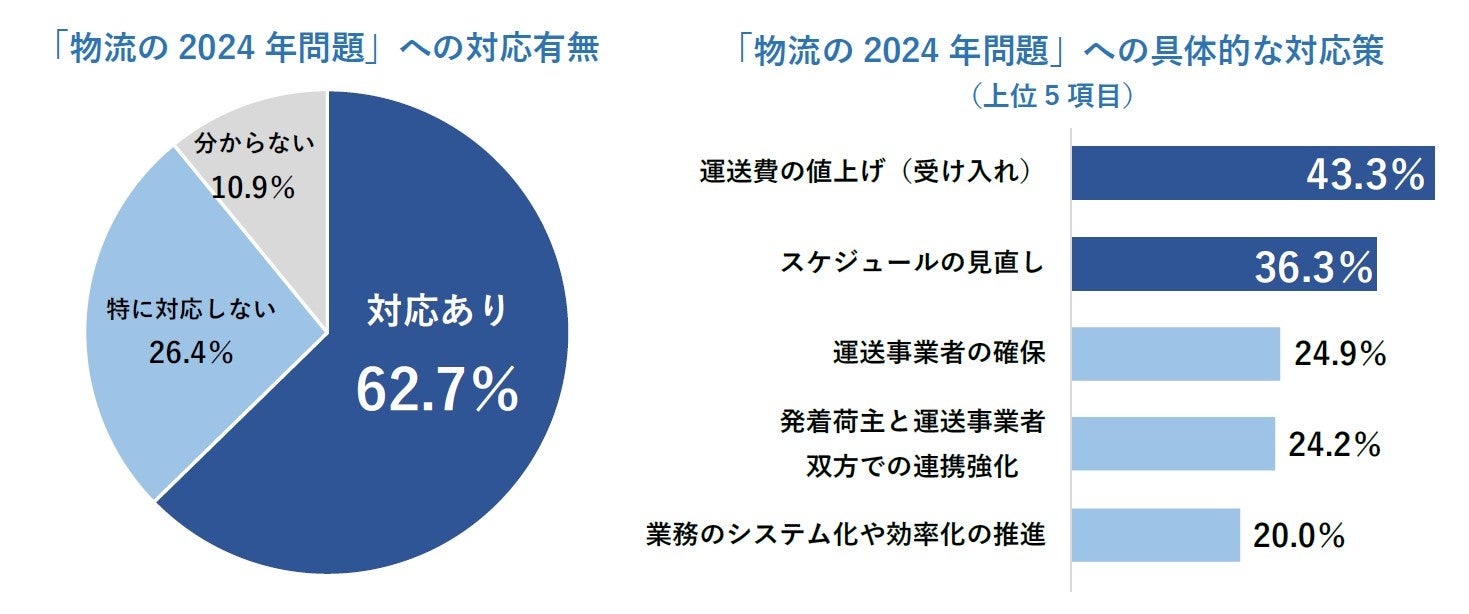 特にトラックドライバーの時間外労働上限規制や改善基準告示が改正された物流業の人手不足倒産は27件で、前年同期(15件)からほぼ倍増だった。多くの産業が関わるバリューチェーンのなかで基盤となる物流業に支障が生じれば、対応に追われる必要性も増してくる。実際に、2024年問題に際して物流面の対応を行う企業は62.7%にのぼった 。具体的な対応策も多岐にわたり、運送費の値上げ(受け入れ)やスケジュールの見直しなどが上位となっている。自社の人手不足に関してだけでなく、企業を取り巻くあらゆるステークホルダーの状況把握にも注意が必要だ。