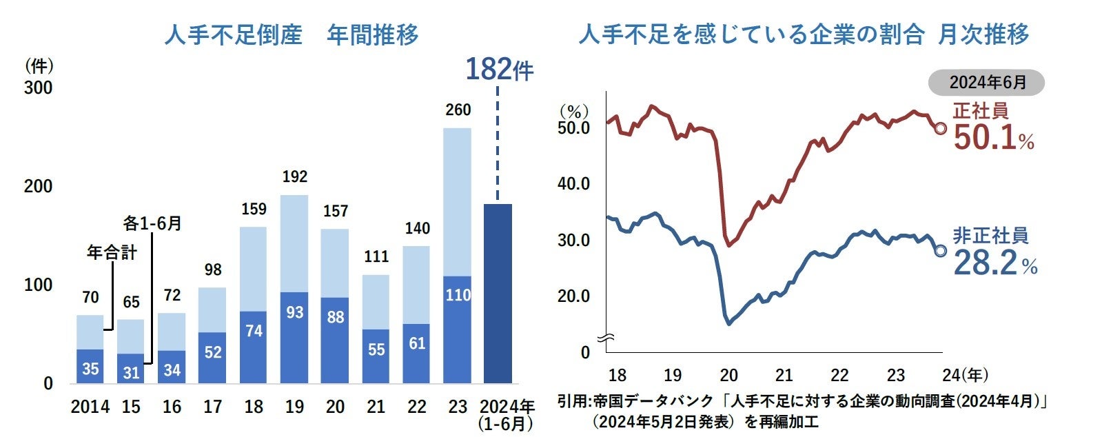人手不足による企業経営への影響が、一段と深刻化している。従業員の退職や採用難、人件費高騰などを原因とする「人手不足倒産」は、2024年上半期(1-6月)に182件発生。年間として、過去最多を大幅に上回るペースで推移している。