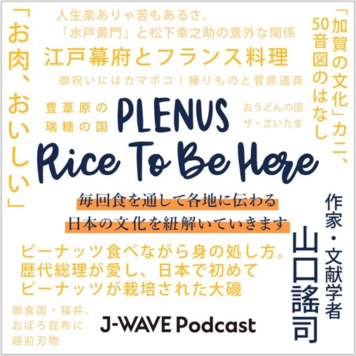 『PLENUS RICE TO BE HERE』は、日本の食文化を通して、地方文化の中で育まれてきた“日本ならではの知恵”を紐解くラジオのコーナーです。ナビゲーターの山口謠司氏(作家・文献学者)が、その土地に実際に足を運んで取材を行い、現地で得たその土地々々の風俗から食文化の情報を、テンポよくご紹介しています。