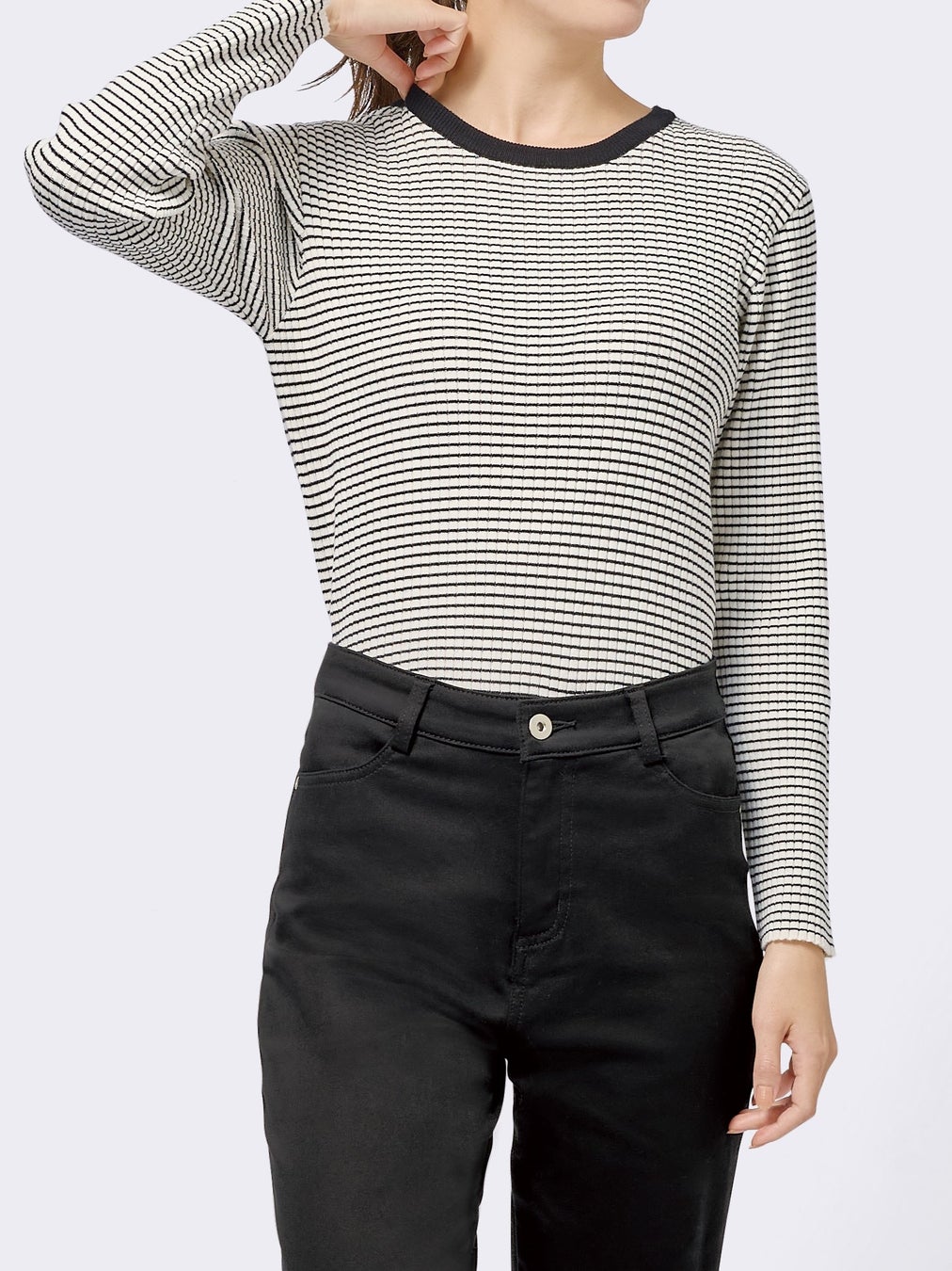 クルーネックボーダー柄リブニットプルオーバー