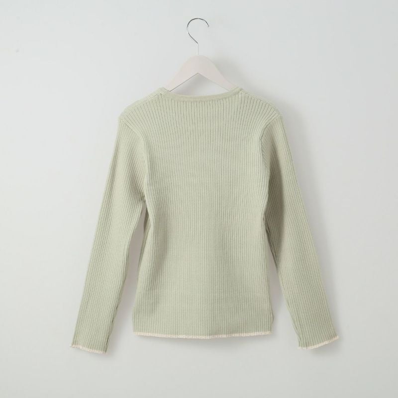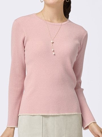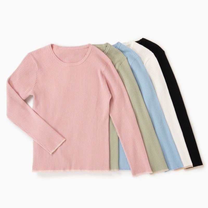 程良いフィット感でジャケットやジャンパースカートのインなどにも着られるすっきりとしたリブニット。袖口と裾にさり気なく施したラメラインがポイントです。冬は重ね着に、春先は1枚着として着られるので色違いで揃えるのもおすすめです。