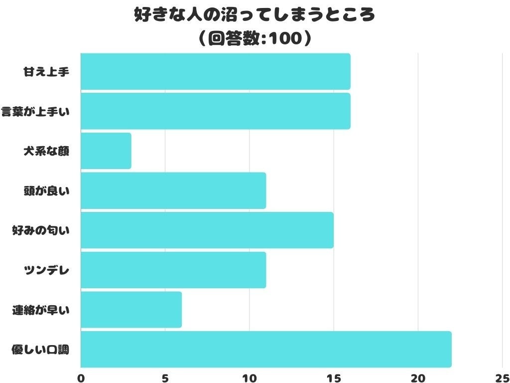 好きな人の沼ってしまうところをアンケートにて調査したところ、1位は「優しい口調」でした。