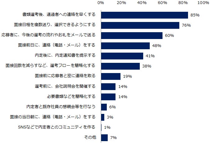 「貴社では、選考辞退対策をしていますか?」と尋ねたところ、52%の企業が「はい」と回答。企業規模別では、「1~49名」が(45%)、「1,000名以上」が(78%)と、33ポイントの差がつく結果となりました。具体的な選考辞退対策を伺うと、トップ3は「書類選考後、通過者への連絡を早くする」(85%)、「面接日程を複数送り、選択できるようにする」(76%)、「応募者に、今後の選考の流れやお礼をメールで送る」(60%)でした。選考辞退対策の効果やエピソードをご紹介します。