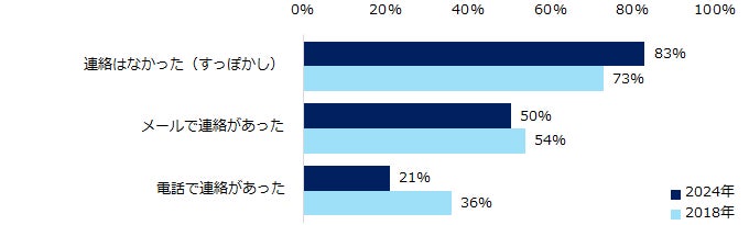 直近1年以内の中途採用で選考辞退が発生した企業に、辞退発生のタイミングを聞いたところ「書類選考通過者による”面接前の辞退”」(60%)が最多。2018年の同調査(※)より6ポイント増加しました。「面接前日・当日の”ドタキャン辞退”」(52%)と回答した企業の辞退連絡の有無については、83%が「連絡はなかった(すっぽかし)」と回答。2018年の同調査より10ポイント増加しています。※https://corp.en-japan.com/newsrelease/2018/14349.html