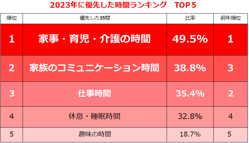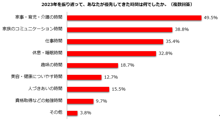 1.2023年に優先した時間 1位「家事・育児・介護の時間」49.5%