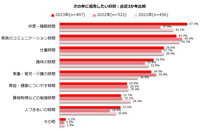 新型コロナウイルス感染症が5類に移行し、コロナ禍前の日常へと戻していく一年となった2023年。就労志向のママたちに「2023年を振り返って、あなたが優先してきた時間は何でしたか」と尋ねたところ、半数近くが「家事・育児・介護の時間」と回答し最も多くなりました。さらに「家族のコミュニケーション時間」「仕事時間」と続きます。直近3か年の傾向を見ると、「人づきあいの時間」が年々上昇しており、外出自粛などで押さえられてきた人との交流が戻りつつあることが伺えます。一方、「2024年にあなたが優先したいと願う時間は何ですか」との質問には、「休息・睡眠時間」と回答した人が最も多くなりました。昨年1・2位だった、「家族のコミュニケーション時間」「仕事時間」を抑えてのトップです。長かったコロナ禍疲れや物価高による家計のやりくりなど、ママたちにとって2023年は特に疲れを感じやすい一年だったのかもしれません。