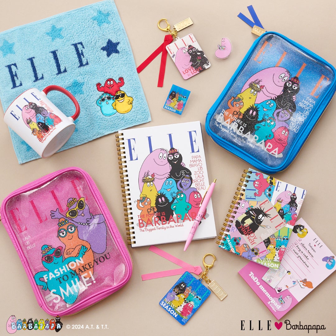 注目は、フランス発祥のライフスタイルブランド「ELLE」とのコラボレーションアイテム!バーバパパファミリーが雑誌の表紙を飾っているかのようなキュートなデザインのステーショナリーやポーチなどの雑貨類をはじめ、ロゴ刺繍が施されたおしゃれな巾着やアパレルグッズなど、目が離せない注目のラインアップです。