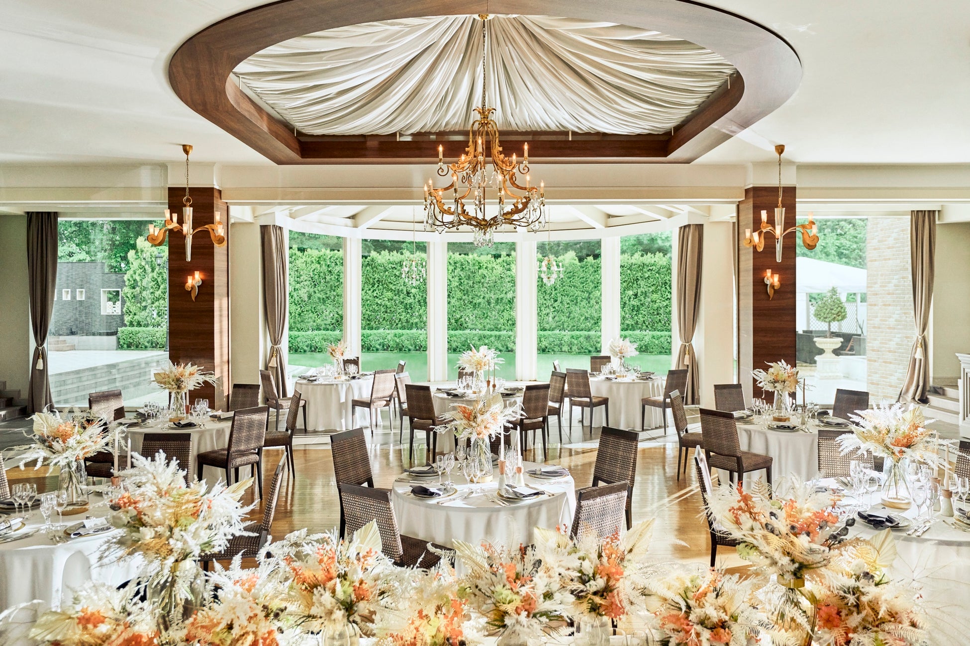 森の奥に佇む「大人の隠れ家」。大きな窓が広がり、どの席からもガーデンが望める解放感で溢れる邸宅。木目のアクセントが会場をシックにまとめています。