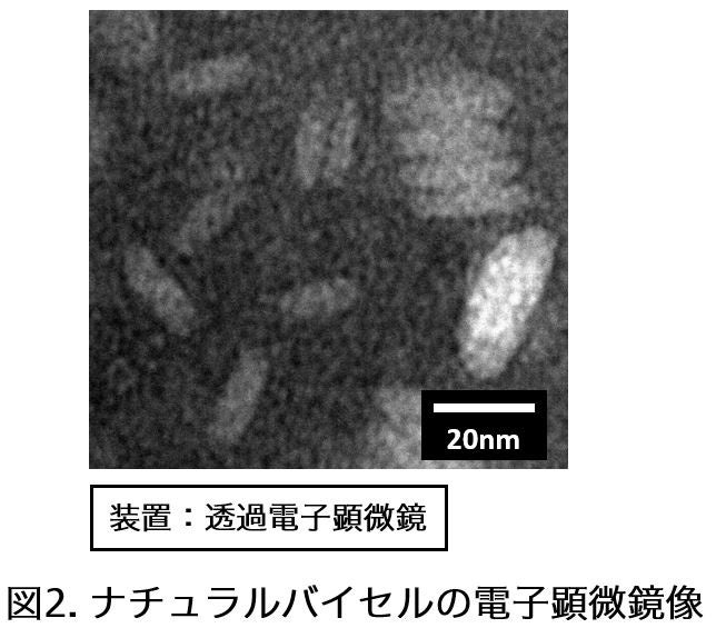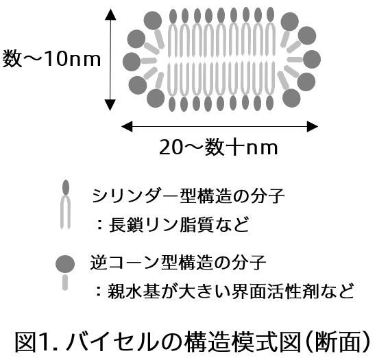バイセルは、生体膜類似物質であるリン脂質を主な成分として構成されるディスク状の構造体です。大きさは平面部分が20~数十nm程度、厚みは数~10nm程度であり、脂質二分子膜構造を持つ製剤の中では最小サイズであると考えられています(図1)。