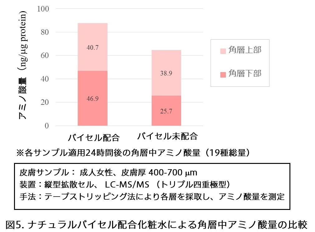 角層の水分保持に重要な役割を果たしているアミノ酸に着目し、アミノ酸を豊富に含有した発酵エキスとナチュラルバイセルを配合したモデル化粧水を用いた浸透性評価を実施し、角層中のアミノ酸量への影響を確認しました。その結果、ナチュラルバイセル配合化粧水を適用した方が、角層中のアミノ酸量が多くなっており、特に角層下部のアミノ酸量が著しく増加(約1.8倍)している事が確認されました。ナチュラルバイセルが発酵エキスを角層の深いところまでより浸透させたことが示唆されました(図5)。