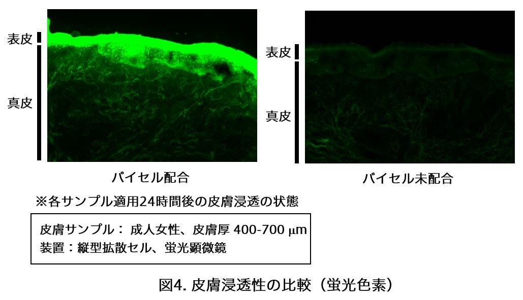 一般的に皮膚に浸透し難いと言われている水溶性成分二種を用いて、ナチュラルバイセルによる皮膚浸透作用を評価しました。ヒト皮膚を用いてカフェインの浸透性を評価した結果、ナチュラルバイセル配合条件下では、カフェインの浸透性を向上させることが確認されました(図3)。また、水溶性蛍光色素を用いて、同様に浸透性を評価した結果、ナチュラルバイセル配合条件下では、真皮まで浸透していることが確認されました(図4)。