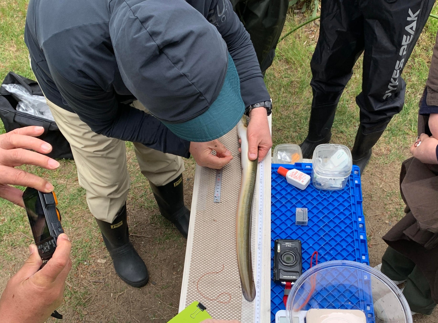 ニホンウナギを見つけた場合は、長さや太さ、重量を測定します。前回調査で見つけた9匹には、個体識別管理のためピットタグ(PITタグ)を埋め込んでおり、同じ個体がいれば、健康状態や生育状況も確認します。海から遡上して来たシラスウナギが、石倉カゴに定着しているのか確認し、今後の資源回復活動の発展に役立てます。