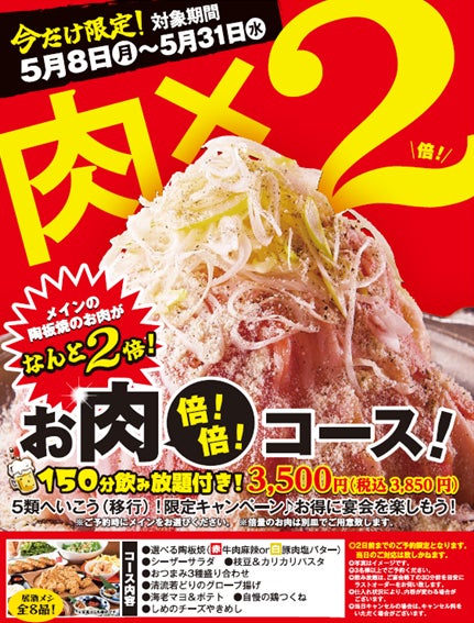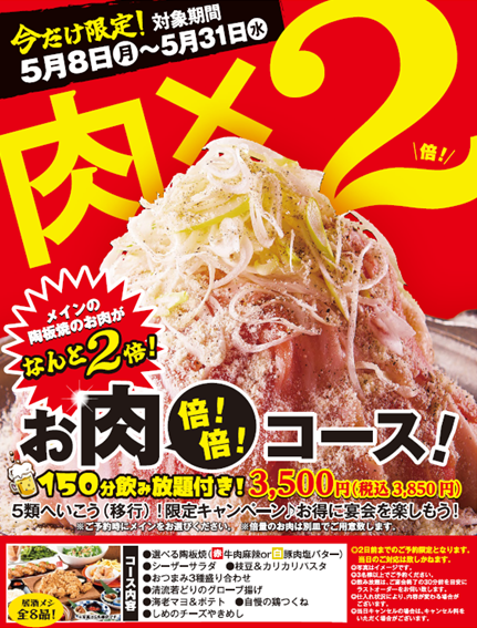 そこで、今回の5類移行を受け、今後さらに日常的な居酒屋のご利用や歓送迎会などの宴会でのご利用を促進するきっかけになればとの思いと、様々な側面で行動が制限されてきたコロナ生活にバイバイを告げる意味を込めて、特別企画「お肉倍々コース」の提供を決定しました。