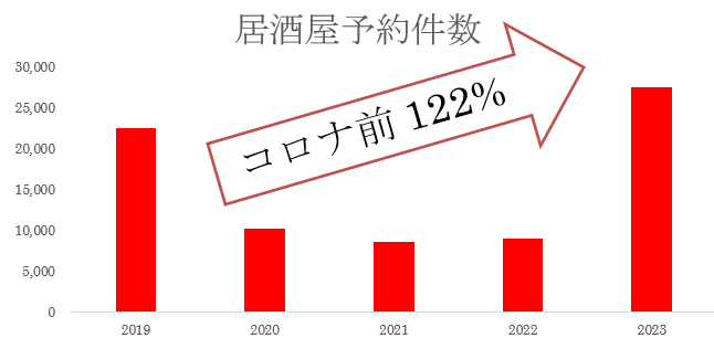 ワタミの外食事業においては、このたびの5類移行に先駆け感染対策としてのマスク着用の考え方が見直された2023年3月以降、宴会コースの需要は前年比300%超の伸長を見せており、ご予約件数はコロナ前の2019年度比で122%となっています。