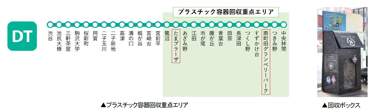二社は南町田グランベリーパーク駅での実績を踏まえ、本取り組みを田園都市線に拡大することを目指し、まずはたまプラーザ駅にも回収ボックスを設置し、鷺沼駅~中央林間駅間をプラスチック容器回収重点エリアと定め、プラスチックリサイクル意識の浸透を図ります。