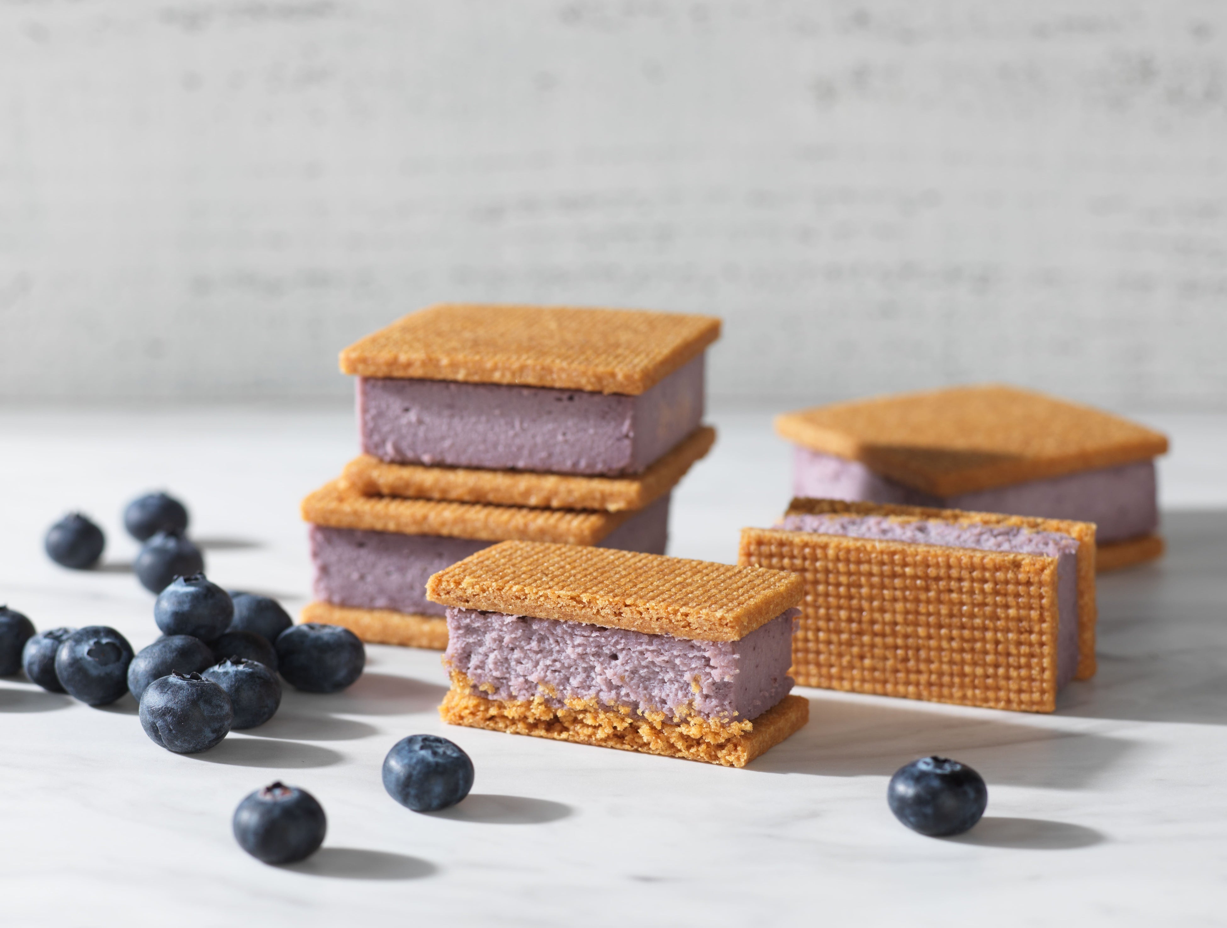 <ブルーベリー> オーストラリア産クリームチーズをベースにしたブルーベリーベイクドチーズケーキをしっとりとしたサブレでサンド。すっきりとしたブルーベリーの味をおたのしみください。