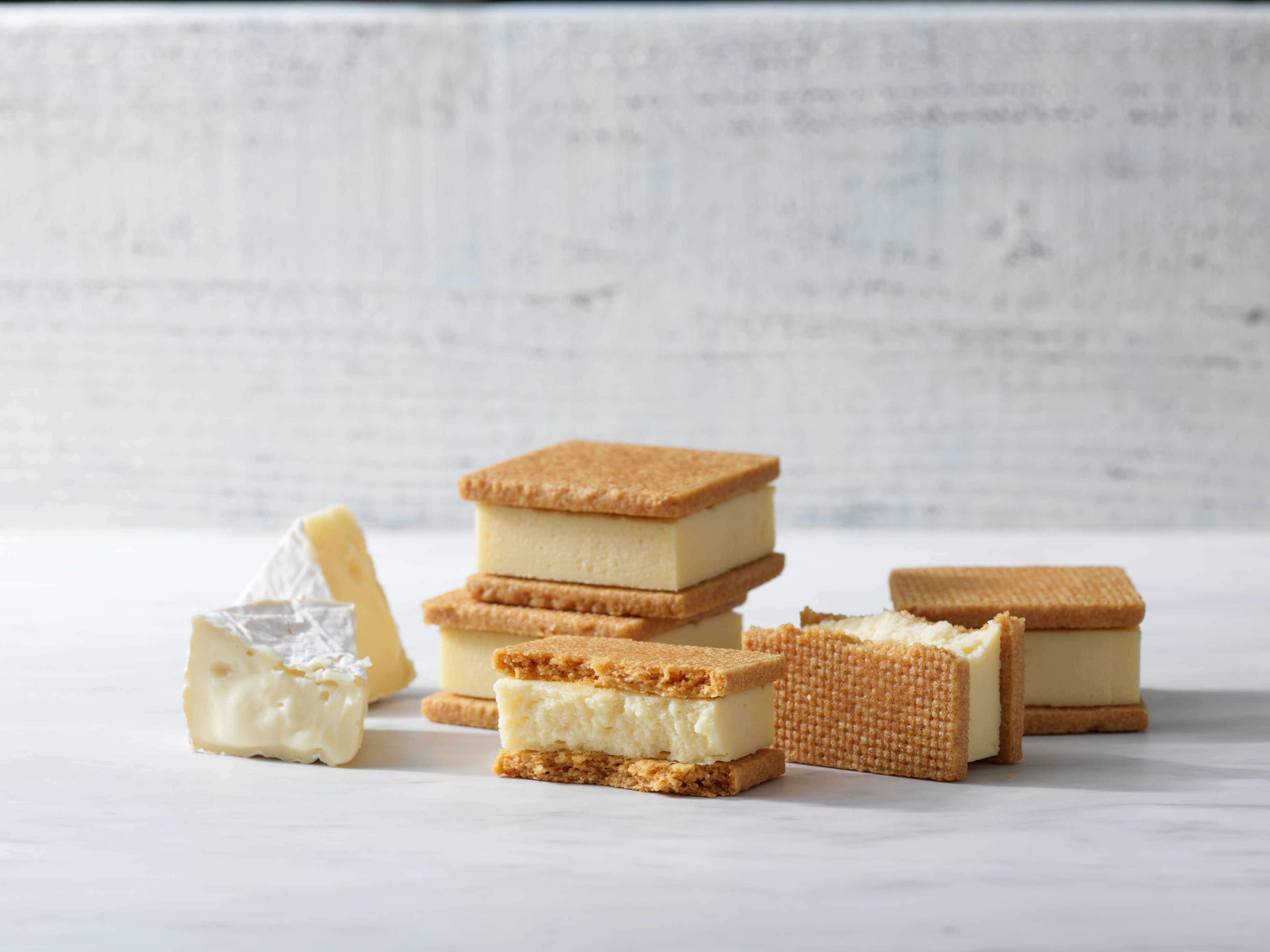 <カマンベール> カマンベールチーズを使用したベイクドチーズケーキを、しっとりとしたサブレでサンドしました。より濃厚でコクのあるチーズの味を楽しめます。