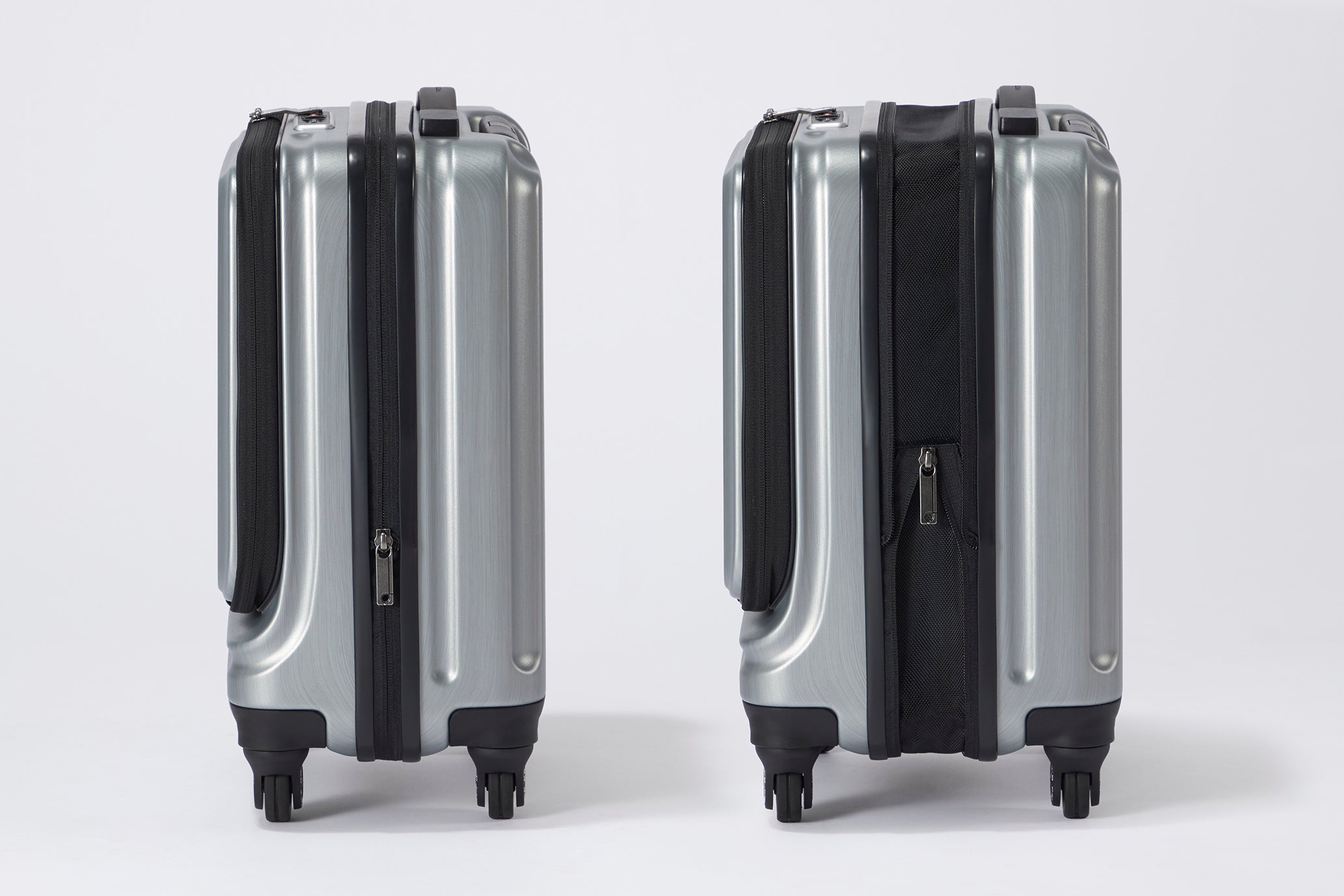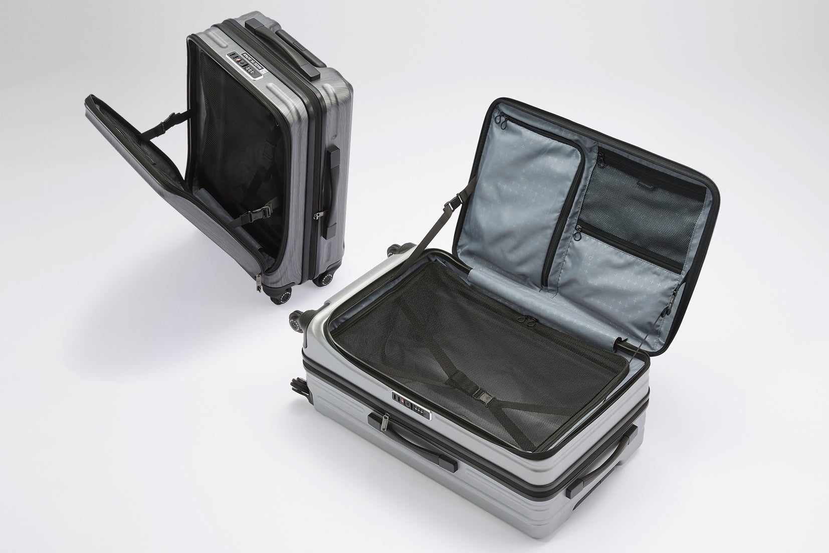 機内持込サイズは立てたまま出し入れできる「縦開き」仕様、預け入れサイズは省スペースで開閉できる「横開き」仕様で、狭い空間でも快適に使えます。