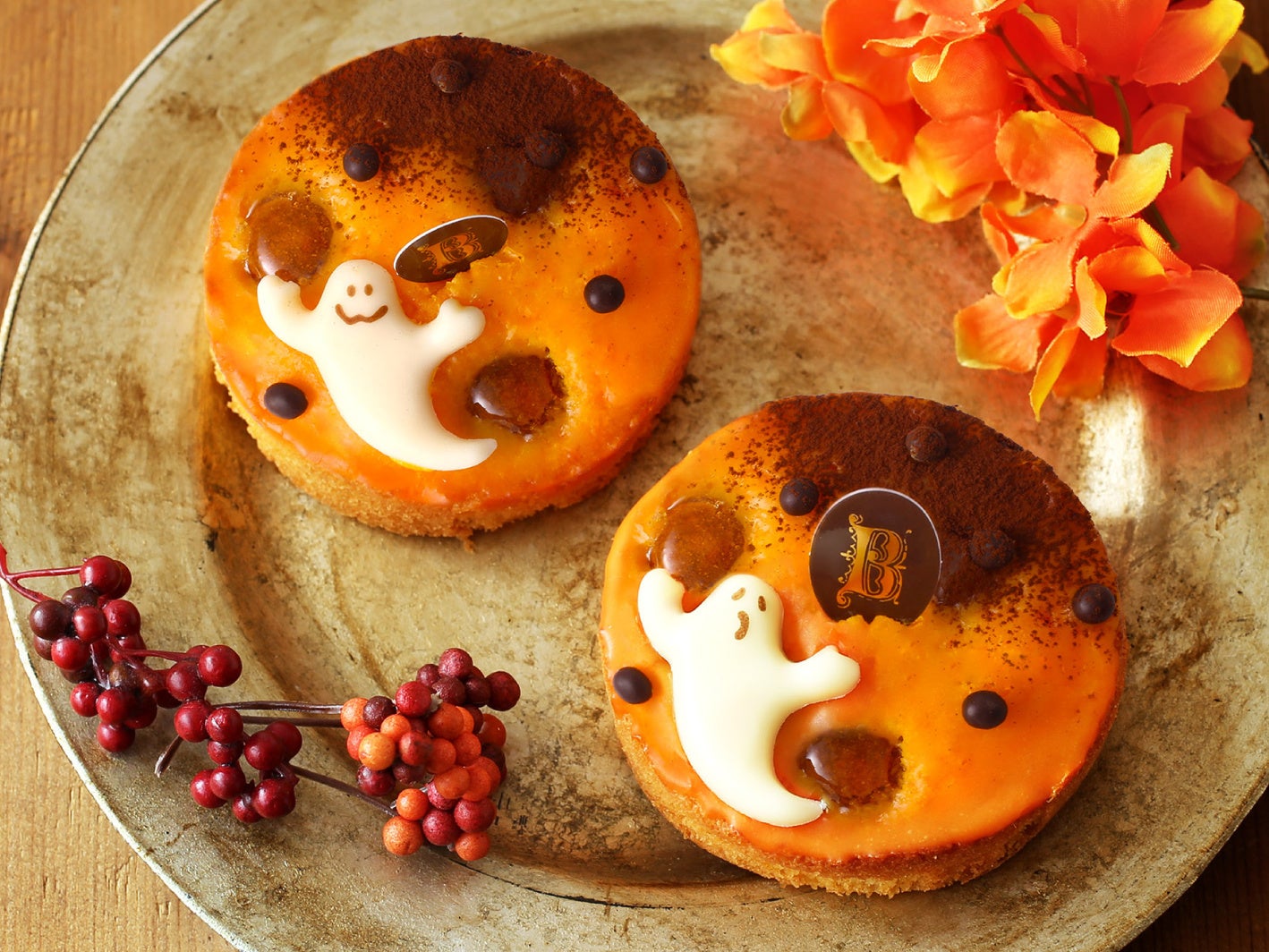 発酵バターとアーモンドの風味豊かな生地に、濃厚なかぼちゃペーストを合わせた秋らしい味わい。ホワイトチョコのおばけなどを華やかに飾りました。