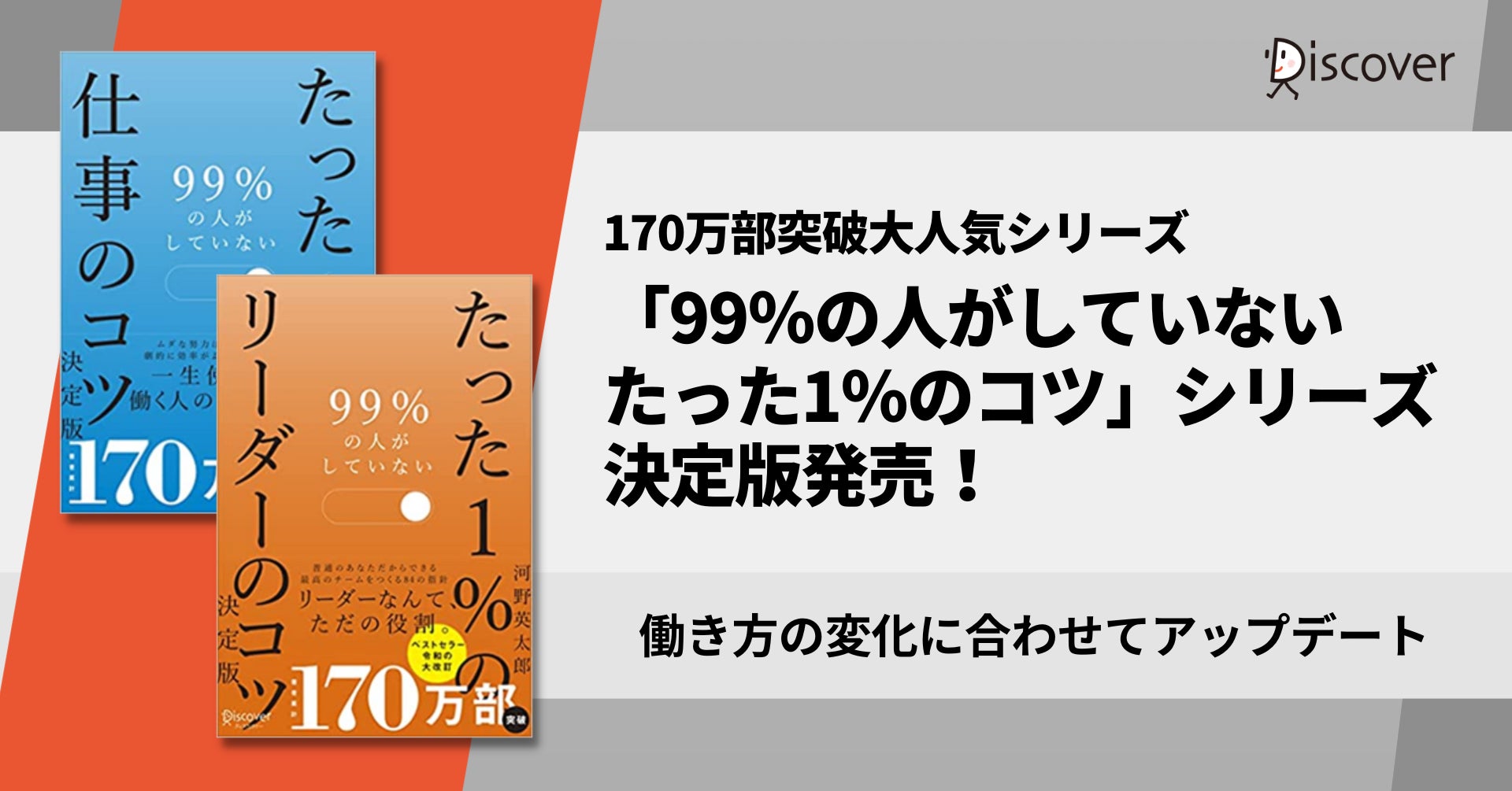 株式会社ディスカヴァー・トゥエンティワン(本社:東京都千代田区、取締役社長:谷口奈緒美)は2022年7月22日に『99%の人がしていないたった1%の仕事のコツ 決定版』『99%の人がしていないたった1%のリーダーのコツ 決定版』(河野英太郎・著)を刊行しました。