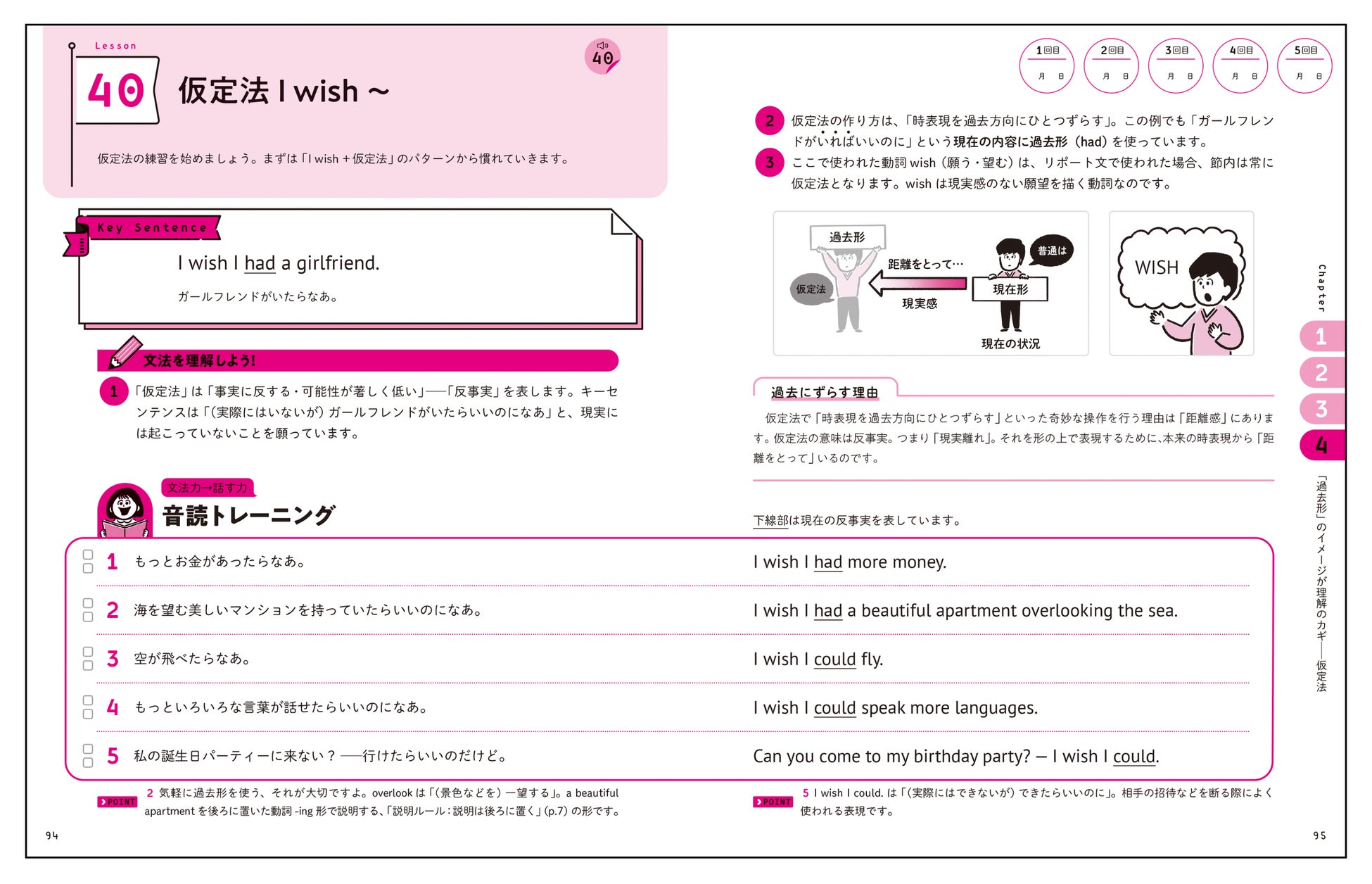 英文法を体に刷り込むための最適なレベルの英文を精選。ワンレッスンたった5文。完走しやすく、読了後の達成感を得られます。