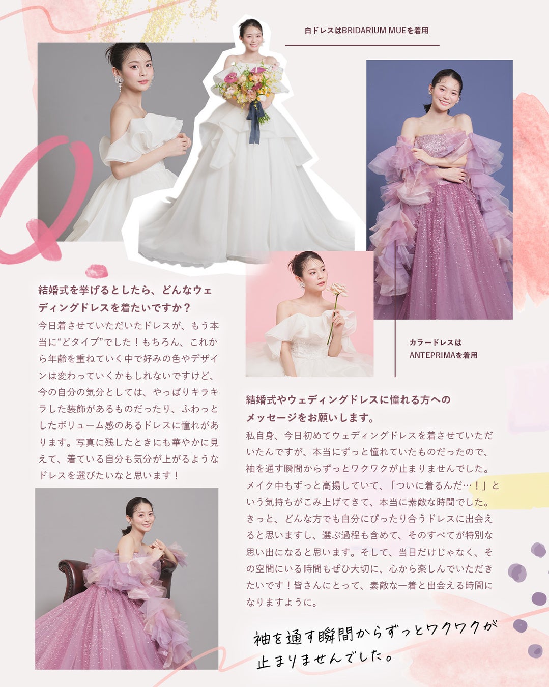 私自身、今日初めてウェディングドレスを着させていただいたんですが、本当にずっと憧れていたものだったので、袖を通す瞬間からずっとワクワクが止まりませんでした。メイク中もずっと高揚していて、「ついに着るんだ…!」という気持ちがこみ上げてきて、本当に素敵な時間でした。きっと、どんな方でも自分にぴったり合うドレスに出会えると思いますし、選ぶ過程も含めて、そのすべてが特別な思い出になると思います。そして、当日だけじゃなく、その空間にいる時間もぜひ大切に、心から楽しんでいただきたいです!皆さんにとって、素敵な一着と出会える時間になりますように。(インタビューより抜粋)